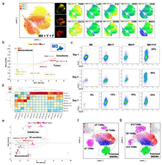 Evolution and modeling of BMDM phenotype into a TAM-like state. (a) Analysis of unstimulated BMDM (M0) phenotype over time in 3D co-cultures. UMAP clustering showing macrophages from the M0+F+Y co-culture at d1, d3 and d7 combined. Heatmaps provide detailed distribution of marker expression, highlighting different subpopulations and evolution over time. (b) PCA analysis of M0 BMDM phenotype trajectory over time in 3D cultures, compared to day 7 melanoma TAMs. (c) Representative dot plots of M1/M2 markers iNOS/Arg1 in M0 BMDMs as mono-cultures and different combinations of macrophage 3D co-cultures, and their evolution over time. (d) Hierarchical clustering of marker z-score of macrophages from polarized BMDM profiles, 3D co-cultures at d7 and early (d7) and late (d14) melanoma tumors. (e) PCA analysis of macrophage phenotype over time in 3D co-cultures. Highlighted in color, M0 3D mono-cultures and co-cultures and TAMs, collected on day 7. Dashed circles delineate the phenotypic space by sample type, showing the partial overlap between the YUMM TAMs and in vitro “3D TAMs”. (f) UMAP clustering of macrophages from 3D mono- and co-cultures and early (d7) melanoma tumors, comparing single-cell phenotype. (g) UMAP clustering of macrophages from 3D mono- and co-cultures and late (d14) melanoma tumors, comparing single-cell phenotype.