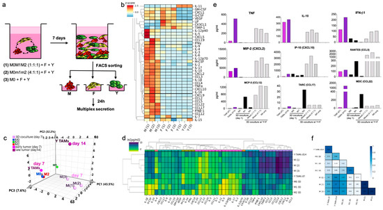 BMDM transition into an immunosuppressive TAM-like functional profile after 7 days of 3D co-culture. (a) Schematic representation of the isolation of components after 3D co-culture for secretion profiling combining BMDMs with fibroblasts and YUMM cells. (b) Heatmaps with z-scores for all the proteins studied in all three fractions. (c) Functional profile of ‘3D TAMs’ compared to melanoma TAMs. PCA of the bulk secretion of macrophages from 3D co-cultures, in vitro stimulated BMDMs and TAMs from YUMM early and late tumors. (d) Hierarchical clustering of 43-plex secretion profile analysis of ‘3D TAMs’ and Y TAMs at early and late timepoints compared to 3D BMDM reference polarized states. (e) Bar graphs with the absolute concentration of secreted cytokines/chemokines in sorted macrophages from 3D co-cultures at day 7, and compared with polarized reference BMDMs and early and late Y TAMs. (f) Heatmap of Pearson correlation of the secretion profiles of BMDM in 3D cultures and d7 and d14 melanoma TAMs. In M0M1M2, polarized BMDMs were mixed in equal parts in the same culture. In M0m1m2, polarized BMDMs were mixed in ratio 4:1:1 in the same culture.