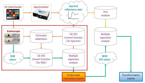 The flow chart of spectrum conversion construction, using standard 24 color blocks (X-Rite Classic, 24 Color Checkers) as the common target object for spectrum conversion of the endoscope and spectrometer, converting the endoscopic images into 401 bands of visible light spectrum information.