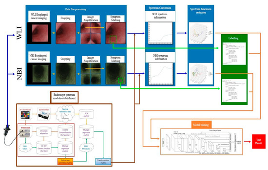 The color image obtained by the white-light and narrow-band endoscope needed to be subjected to a series of preprocessing. In order to increase the training data, the preprocessed images were augmented, and the label information of the data was created based on this, which contained the name and coordinate location of the disease stage. On the other hand, using 24 color blocks as the reference object, a spectrometer was used to establish an image spectrum conversion module for the endoscope. By using the multivariate regression analysis, the conversion matrix that converted the endoscopic images into the spectrum of the visible light band could be obtained. With the conversion matrix, the images could be converted into the spectrum of the visible light band to obtain the spectrum information of the esophageal cancer. Next, the spectrum information of esophageal cancer was reduced by principal component analysis. Finally, by using SSD we trained a diagnostic model to predict the number and location of esophageal cancers, based on frequency spectrum.