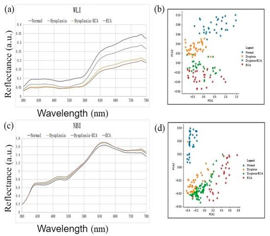 The spectrum information obtained by image spectrum conversion has 401 characteristic dimensions in the visible light band (380–780 nm). Figure 3a,c shows the spectrum of esophageal cancer in four stages: normal, low-grade dysplasia, high-grade dysplasia, invasive cancer of white-light endoscopic images and narrow-band endoscopic images, respectively. The high-dimensional spectrum information of the white-light and narrow-band endoscopes is reduced to three-dimensions using principal component analysis (PCA) [30]. The two kinds of endoscope spectrum information after dimension can show good variability between the severity of esophageal cancer as shown in Figure 3b,d.