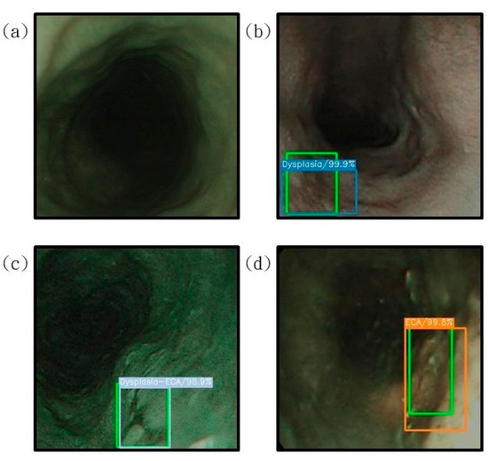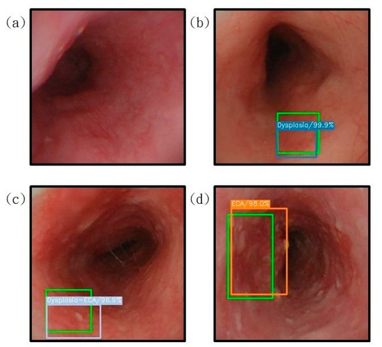 The results of the prediction of esophageal cancer are displayed on the narrow-band endoscopic imaging, where the correct position (green rectangle) is compared with the predicted result; (a) is the normal esophageal test result, which is not displayed under the diagnosis of SSD; (b) shows the detection result with low-grade dysplasia. Under the diagnosis of SSD, the blue bounding box surrounds the lesion area; (c) shows with the area between high-grade dysplasia and low-grade dysplasia. The test result shows that the gray bounding box surrounds the lesion area under the diagnosis of SSD; (d) shows the detection result of the invasive cancer area, and the orange bounding box surrounds the lesion area under the diagnosis of SSD.