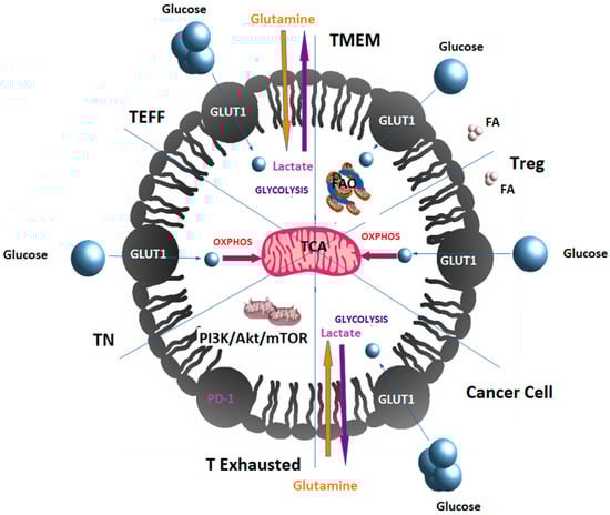 Glucose sensing regulates and shapes T-cell responses as glucose transporting GLUT1 expression and glycolysis promote TEFF cell and Treg cell proliferation impair Treg cell lineage stability and suppressive function [54] (Wei et al. 2017). T and tumor cells reprogram their metabolism to enhance glucose uptake and aerobic glycolysis to compete for glucose in the TME and in the glucose-limited TME, the immune response of tumor-infiltrating T cells is less effective than in T cells from glucose-rich environments [54]. Activated T cells have a glucose-sensitive metabolic checkpoint controlled by AMPK, which regulates mRNA translation and glutamine-dependent mitochondrial metabolism needed to sustain T-cell metabolic homeostasis mediating adaptive immunity [55].