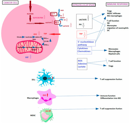 Changes that disrupt the amino acids metabolism and availability in the TME constitute important targets for cancer cells to circumvent the immune response since immune cell correct functioning requires homeostasis of the amino acid metabolism. For example, Indoleamine 2,3-Dioxygenase (IDO) expression can be induced by Interferon-gamma (IFNγ) or can be constitutively overexpressed by mutations in BIN and KIT oncogenes [27]. IDO regulates the tumor functions associated with inflammation and its overexpression leads to tryptophan deprivation, which suppresses CD8+ T effector cells and NK cells while inducing Tregs and MDSC, impairing immune cell functions (Figure 3) [27]. Furthermore, overexpression of glutaminase leads not only to depletion of glutamine levels but also to high glutamate levels that might impair the immune function [28]. Cysteine is necessary for glutathione synthesis, ROS detoxification, and T-cell activation [39] (Siska et al. 2016). Thus, inhibition of cysteine uptake impairs T-cell activation, as it is critical for the Reactive Oxygen Species (ROS) detoxification machinery [28].