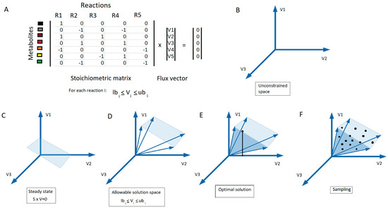 Genome-scale metabolic modeling. (A) FBA optimization maximizes a linear objective function, ψ(v), formed by the dot product of the flux vector containing each reaction flux, (vi) by a predetermined coefficient, ci, in the stoichiometric matrix (S) subject to a steady-state assumption, Sv = 0, as well as lower and upper bounds on each reaction flux (lbi and ubi). From the unconstrained space (B), the allowable solution space is defined by specifying the steady-state assumption (C), as well as lower and upper bounds on each reaction flux (D). Various methods can then be used to interrogate the solution space, such as (E) optimization for a biologically motivated objective function to identify a single optimal solution (e.g., flux vector in case FBA optimization method is used) or (F) sampling to provide an unbiased characterization via flux vectors uniformly distributed in the solution space.