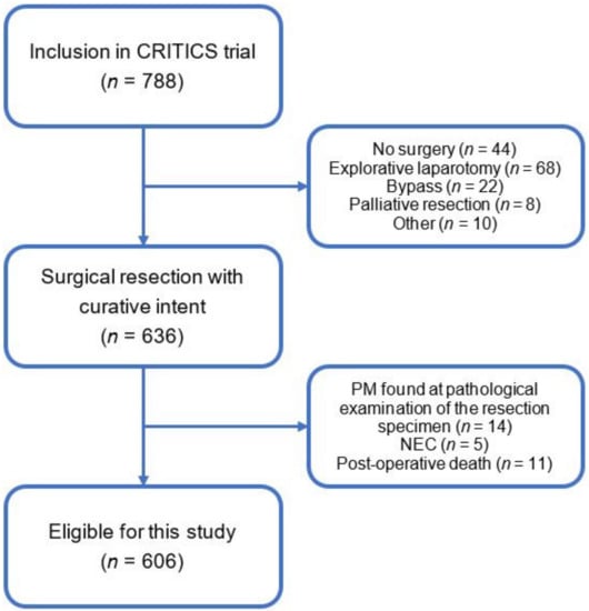 Of the 788 patients included and randomized in the CRITICS trial, 636 underwent surgery with curative intent. After the exclusion of patients with neuroendocrine carcinomas (n = 5; 1%), or peritoneal metastasis detected during histopathological examination of the resection specimen (n = 14; 2%) and post-operative deaths (n = 11; 2%), 606 patients were included in this analysis (Figure 1). Baseline characteristics and tumor characteristics are summarized in Table 1 and Table 2, respectively.