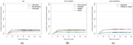 Cumulative incidences of events were estimated using the competing risk methodology. We distinguished between metachronous isolated peritoneal metastasis and ‘other events’. Univariable and multivariable regression models were fitted for subdistributions of a competing risk using the Fine and Gray method. Risk factors significant in the univariable analysis at p ≤ 0.05 were further investigated in a multivariable analysis. Unknown histology was considered to be of diffuse or mixed type. Unknown lymphatic and vascular invasion was considered to be positive. In a sensitivity analysis, we also considered unknown histology to be of intestinal type, and lymphatic and vascular invasion to be negative, which led to virtually no changes in the estimated parameters. All analyses were performed using IBM SPSS statistical software version 25 (IBM Corp., Armonk, NY, USA) and R version 3.5.1 (R Core Team, Vienna, Austria).