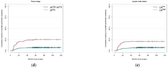 Figure 2 shows cumulative incidences of isolated peritoneal metastasis for all five risk factors found significant in univariable analysis. The two-year cumulative incidence of PM was 12% (95% CI 8–16%) in patients younger than 60 years old, versus 8% (95% CI 4–11%) in patients between 60–69 years old, and 4% (95% CI 1–7%) in patients older than 70 years (Figure 2a). Patients with a GE-junction tumor localization had a significantly lower two-year cumulative incidence of 5% (95% CI 1–9%), versus 12% (95% CI 6–18%) in proximal gastric cancer (Figure 2b). The two-year cumulative incidence of PM in diffuse or mixed type gastric cancer was 13% (95% CI 9–16%), compared to 3% (95% CI 1–6%) in intestinal type gastric cancer (Figure 2c). Furthermore, patients with serosal involvement (ypT4) had a significantly higher two-year cumulative incidence than those with ypT0-3 tumors, i.e., 21% (95% CI 13–28%), versus 6% (95% CI 4–8%) (Figure 2d). Comparable results were observed for lymph node involvement, with a two-year cumulative incidence of 20% (95% CI 14–26%) in LNhigh tumors, compared to 5% (95% CI 3–7%) in LNlow tumors (Figure 2e). All five risk factors were further investigated in multivariable analyses.