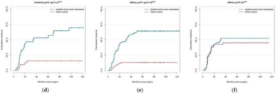 Histological subtype, tumor stage and lymph node involvement were, likewise, investigated in the multivariable analysis on (concurrent) distant metastasis, locoregional recurrence and death, accounting for metachronous isolated peritoneal metastasis as a competing risk. LNhigh was found to be an independent risk factor for the ‘other events.’ Both diffuse or mixed histological subtype and ypT4 were not significantly associated with ‘other events’ (Table 5).