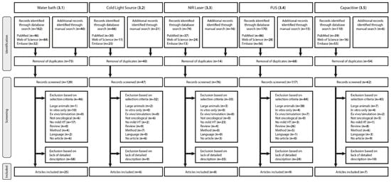 PRISMA flow diagram illustrating selection of the articles for each hyperthermia technique. This review presents a detailed description of the water bath (Section 3.1), cold light source (Section 3.2), NIR laser (Section 3.3), FUS (Section 3.4), and capacitive hyperthermia (Section 3.5) methods.