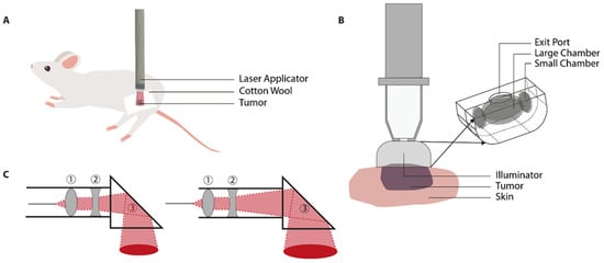 Another factor to take into consideration is the Gaussian intensity distribution of the laser beam []. When applying laser light using a bare-tipped optical fiber, the directional beam may create a hot spot in the center of the target area. Therefore, there may be non-homogeneous heating, as the tissue located at the boundaries of the beam receives a lower light dose in comparison with tissue in the beam center. Manipulation of the laser beam to establish focalized treatment occurs either through the use of multiple lenses and prisms or with the use of a custom-built illuminator. The diameter of the laser beam can be adjusted to the tumor size by varying the distance between the lenses and the prism [,] (Figure 4C). The use of an illuminator provides homogeneous light distribution by passing light through three aligned chambers lined with reflective material (Figure 4B). The size of the beam hitting the tissue surface depends on the size of the exit port in the middle chamber [,,,]. Upon reaching the tumor tissue, continuous heating occurs as the laser beam will initially heat the upper layer, which gradually spreads to the underlying tissue layers 2–10 mm deep [,,]. In order to establish mild hyperthermia, the output energy of the laser can be adapted by either changing the beam size (mm) or the laser intensity (W/cm2).