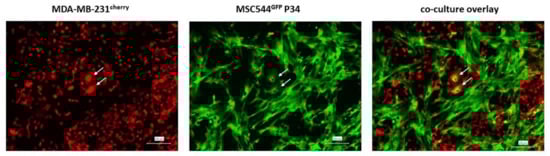 Cancer-cell fusion in vitro. Cancer-cell fusion of cherry-labeled human MDA-MB-231 breast-cancer cells (left panel) with the GFP-labeled human MSC544 cell line in P34 (middle panel) was detectable following a 4 day co-culture similar to previous experimental approaches [45]. Two evolving breast-cancer hybrid cells became detectable after spontaneous fusion (white arrows), which simultaneously expressed the cherry (left panel) and GFP genes (middle panel) in a fluorescence overlay by displaying a yellow color (right panel). Bars represent 200 µm using a BZ-X800 Keyence fluorescence microscope.
