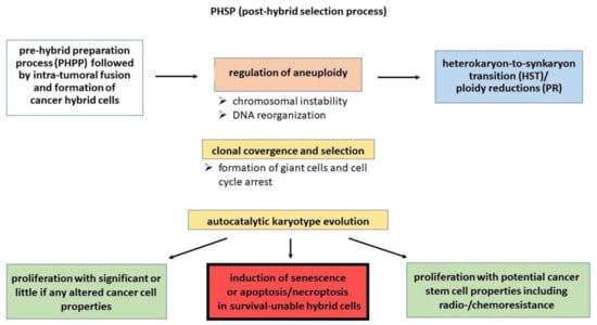 In contrast to chromosomal recombination after the fusion of two haploid nuclei in the fertilized oocyte, the process of HST/PR in diploid or aneuploidy cancer cells is much more complex since two discrete diploid nuclei in the fused cancer hybrid cells do not simply merge to a newly formed tetraploid nucleus. Instead, HST/PR is rather a mitosis-like process indicating preceding active cell cycle [36,38,66]. The formation of a stabilized and clonally converged new phenotype from fused cancer hybrid cells requires a PHSP as a multi-step program.