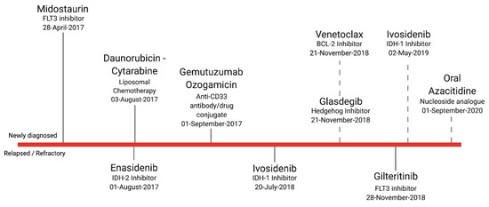 The picture becomes even more complicated when analyzing differential cytogenetic and molecular landscapes in patients with R/R AML. Multiple analyses at the chromosomal, mutational, and immunophenotypic levels have depicted the complexity of disease resistance and progression [10,11,12]. The biological networks that underlie these processes, while incompletely characterized, will undoubtedly represent exciting avenues for therapeutic development in years to come. In this review, we overview recently approved and emerging targeted therapies for the evolving molecular landscape of de novo and R/R acute myeloid leukemia.