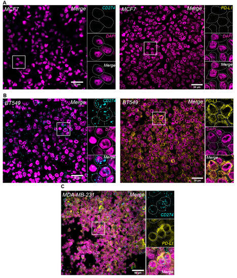 PD-L1 mRNA and protein expression were evaluated in BC cells and were concordant both in the PD-L1-negative (MCF7) and -positive (BT549) cell lines (Figure 1, upper and middle panel). The analytical validity of RNA in situ hybridization (RNA-ISH) using RNAscope® combined with immunofluorescence (IF) for PD-L1 mRNA and protein levels in the same FFPE tissue section was evaluated in this study. Sequential RNA-FISH-IF was performed in the PD-L1-positive MDA-MB-231 BC cell line, and high expression levels of both PD-L1 protein and mRNA were noted in the same cells (Figure 1, lower panel).