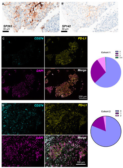 Concordance between PD-L1 IHC/PD-L1 IF and bulk PD-L1 gene expression: In cohort 1, CD274 transcripts were not statistically significantly associated with protein expression according to SP142 (Mann–Whitney p = 0.357), SP263 (p = 0.512) or IF (Spearman’s rho = 0.200, p = 0.164).