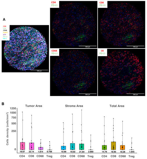 In order to further evaluate the cell origin of PD-L1 protein expression, we applied a multiplex fluorescent IHC method using different immune cell and epithelial markers. PD-L1 mean cell density in the total area (measured in cells/mm2) as assessed by multiplex fluorescent IHC was significantly correlated with PD-L1 IHC assessment by both SP142 (Mann–Whitney p = 0.008) and SP263 (p = 0.012). We also assessed the co-expression of PD-L1 and markers that define specific immune cell subpopulations: CD4 and CD8 for lymphocytes, FoxP3 for regulatory cells, and CD68 for macrophages, as well as PD-L1 expression in cytokeratin-positive tumor cells. Both the PD-L1 mean cell density in the total area and in different cellular compartments (stroma versus tumor) were assessed (Figure 3A). Overall, PD-L1 was mainly expressed in lymphocytes (mean cell density of PD-L1+/CD4+ cells: 14.7 cells/mm2 and of PD-L1+/CD8+ cells: 18.9 cells/mm2). However, in the stromal compartment, macrophages were the most common PD-L1-expressing cells (mean cell density of PD-L1+/CD68+ cells: 21.6 cells/mm2), followed by cytotoxic lymphocytes (mean cell density of PD-L1+/CD8+ cells: 19.0 cells/mm2). As expected, PD-L1-expressing tumor cells were dominant in tumor-rich areas, followed by infiltrating lymphocytes. The mean cell density of PD-L1+/CK+ cells was 153.1 cells/mm2, significantly higher than the density of PD-L1+/CD8+ cells (22.1 cells/mm2, Wilcoxon signed-rank p < 0.001) or PD-L1+/CD4+ cells (19.6 cells/mm2, p < 0.001). In addition, the density of PD-L1+/CD68+ cells in the tumoral compartment was significantly lower than in the stroma (p = 0.001). PD-L1-positive T regulatory cells (FoxP3+) were uncommon: mean cell density of 2.6 cells/mm2 in the stromal and 0.7 cells/mm2 in the tumoral compartment (Figure 3B).