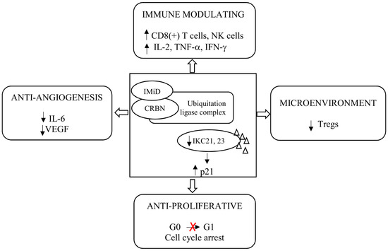 The IMiDs, by binding CRL4CRBN E3 ligase, cause ubiquitination and degradation of disease-related proteins. The components of the CRL4CRBN E3 ligase and its activity are important for the anti-myeloma activity of IMiDs [25]. The key neosubstrates in PCs are Ikaros (IKZF1) and Aiolos (IKZF3) [26,27]. These transcription factors (TFs) regulate cell fate in normal lymphopoiesis and PCs development [28]. Both Ikaros and Aiolos increase interferon regulatory factor 4 (IRF4) and c-MYC, which form a positive autoregulatory loop that is necessary for PCs’ proliferation. These four TFs are called the axis of Ikaros. The IMiDs lead to the rapid degradation of Ikaros and Aiolos through CRBN-dependent ubiquitination, leading to the downregulation of IRF4 and c-MYC [29]. As mentioned above, IMiDs, in addition to their direct anti-myeloma effect, have an indirect anti-myeloma effect, reducing the secretion of pro-inflammatory cytokines, including tumor necrosis factor-alpha (TNF-α) interleukin (IL)-1, IL-6, 12, and IL-16. The consequence of the reduction in these cytokines is the inhibition of the proliferation and migration of neoplastic PCs and apoptosis [30]. Lenalidomide and pomalidomide, compared to thalidomide, more strongly induce apoptosis of neoplastic PCs by activating tumor suppressor genes, including p21, an inhibitor of cyclin-dependent kinase (CDK). Inhibition of CDK activity arrests the cell cycle in the G0/G1 phase and apoptosis of the PC [22]. IMiDs enhance co-stimulation of T lymphocytes, which leads to increased secretion of interferon γ (IFN-γ) and IL-2, a proliferation of clonal T lymphocytes, and activation of NK lymphocytes [31]. In preclinical studies, lenalidomide and pomalidomide were 300–1200 times more potent than thalidomide at co-stimulating T cells [32,33]. Both lenalidomide and pomalidomide increase the action of NK cells in destroying PC. Lenalidomide further activates NKT cells [34,35]. The main mechanisms of action of IMiDs are presented in Figure 2.