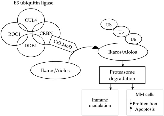 CELMoDs bind specifically to CRBN, thus influencing the activity of E3 ubiquitin ligase and targeting specific substrate proteins, causing them to ubiquitinate. This action degrades some transcription factors, which are proteasome-mediated transcriptional repressors. The consequence of this action is immunomodulation, including the activation of T lymphocytes and the degradation of proteins that play an important role in the proliferation of cancer cells. The mechanism of action of CRL4CRBN E3 ubiquitin ligase and its effects through CRBN-based small molecules are presented in Figure 3.