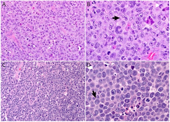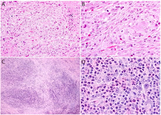 Although the morphologic variants of ALCL are not officially recognized in the ALK- group [1,36], it is still possible to make a diagnosis of ALK- ALCL in cases that have areas with a classic/common morphology adjacent to variant features, namely signet-ring cells, sarcomatoid morphology, or a background rich in neutrophils (“pyogenic-like”) or eosinophils [14,37]. However, this may not be the case for the small cell variant—and to some extent also the lymphohistiocytic variant—that can only be diagnosed as such using ALK immunohistochemistry [14,36,37]. Sarcomatoid ALCL consists of a tumor with a variable proportion of pleomorphic epithelioid cells and spindle cells arranged in short fascicles or in a storiform pattern and a myxoid background with a few scattered small lymphocytes, neutrophils, and/or eosinophils [37,38] (Figure 3A,B). The tumor cells tend to arrange around blood vessels with partial infiltration into the vascular wall. A rare form of ALCL morphologically identical to nodular sclerosis classic Hodgkin lymphoma (CHL) is referred to as ALCL with a “Hodgkin-like pattern” [37,39] (Figure 3C,D).
