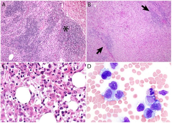 (A) Sinusoidal distribution of ALCL mimicking metastatic carcinoma (asterisk). (B) ALCL with marked expansion of the paracortical area and subtotal effacement of a lymph node. The arrows point to residual compressed lymphoid follicles. (C) ALK- ALCL involving bone marrow. (D) Leukemic ALK- ALCL mimicking monocytic leukemia. The neoplastic cells are intermediate to large with an irregular to reniform nucleus (“hallmark” cells) and moderate to abundant vacuolated cytoplasm.