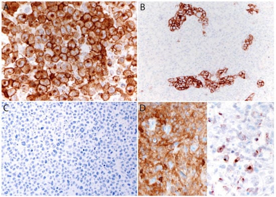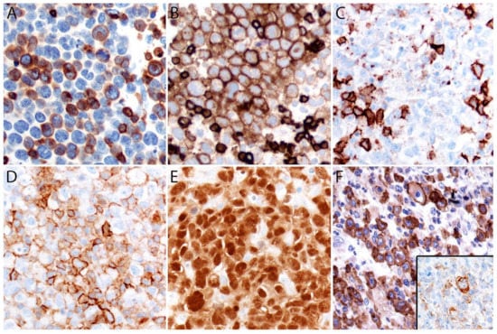 By definition, ALK- ALCL is strongly and diffusely positive for CD30 (>75% of cells) and negative for ALK (Figure 4A–C). CD30 decorates the lymphoma cells with a membranous and paranuclear dot (Golgi) pattern (Figure 4A,B). For uncertain reasons, this lymphoma shows a peculiar paradoxical expression of CD4 and of cytotoxic markers, namely T-cell intracellular antigen-1 (TIA-1), granzyme B, and perforin (Figure 4D). However, it is now well-recognized that DUSP22-rearranged cases are usually negative for cytotoxic molecules [40] (see section on molecular alterations). The T-cell antigens CD2, CD3, CD5, CD7, and CD8 are variably expressed (Figure 5A–C) and cases that lack all T-cell antigens are referred to as having a “null” phenotype [36,41,42]. CD56 and CD45/leukocyte common antigen are variably expressed (Figure 5D), and some cases may be negative for CD45, whereas CD43 is expressed in most cases [3,36,42]. Clusterin and multiple myeloma 1/interferon regulatory factor 4 (MUM1/IRF4) are usually positive (Figure 5E), and in contrast to ALK+ ALCL, only ~40% of cases are positive for the epithelial membrane antigen (EMA) [3] (Figure 5F). ALK- ALCL is negative for CD15, B-cell markers (CD19, CD20, CD79a, PAX5), and for EBER by in situ hybridization. However, pathologists should be aware that rare cases may be positive for CD15 and/or PAX5, the latter due to extra copies of the PAX5 gene locus [43]. Likewise, bona fide cases of EBER+ ALK- ALCL have been reported but they are very rare [32,33]. Unusual cytokeratin expression has also been reported in rare cases [44,45,46] (Figure 5F inset). ALK- ALCL cases with the TP63 rearrangement are positive for p63 by immunohistochemistry (see section on molecular alterations) [40,47]. Loss of CD30 has been described in sporadic cases after the use of brentuximab-vedotin (anti-CD30) therapy [48,49,50,51].