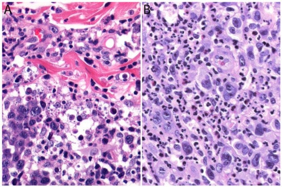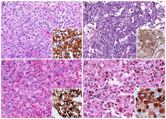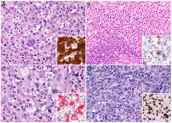 Although carcinomas are readily distinguished by morphology from ALCL given the lack of “hallmark” cells and glandular or squamous differentiation, poorly differentiated cases may show an overlapping morphology with this type of TCL. ALK- ALCL is negative for cytokeratins and the germ cell markers OCT3/4 and SALL4. Embryonal carcinoma usually demonstrates pseudoglandular, papillary, or alveolar patterns that do not suggest lymphoma. However, embryonal carcinoma with a predominant solid pattern can mimic ALK- ALCL. This tumor shows amphophilic to basophilic cytoplasm, marked anaplasia, and is strongly positive for CD30 (Figure 7B), cytokeratin, and germ cell transcription factors, and is negative for T-cell antigens, CD45, and CD43. Poorly differentiated carcinomas are positive for cytokeratins and negative for CD30, T-cell markers, and may or may not be positive for organ-specific transcription factors (p63, TTF1, PAX8, etc.). A careful interpretation of EMA should be performed when the differential diagnosis includes metastatic carcinoma and ALK- ALCL, since EMA may be positive in the latter. Rare cases of ALK- ALCL can be focally positive for cytokeratins and misdiagnosed as a poorly differentiated carcinoma, particularly if EMA is also positive [44,45,46,55] (Figure 5F, inset). Moreover, ALK- ALCL cases with the TP63 rearrangement (see section on molecular alterations) are positive for p63 by immunohistochemistry [40,47] and the interpretation of the isolated expression of p63 does not always translate into a tumor with squamous cell differentiation.