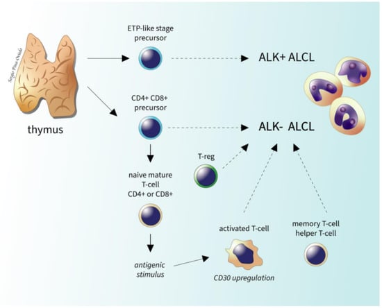 Using DNA methylation profiling it has been discovered that ALK- and ALK+ ALCL have highly similar genome-wide DNA methylation in the genes involved in T-cell differentiation and immune responses (TCR, CTLA-4) and these methylation patterns resemble those of thymic progenitor cells, suggesting a possible thymic origin of ALCL: a double-positive CD4/CD8 precursor T-cell for ALK- ALCL and a CD34+/CD1a− precursor T-cell for ALK+ ALCL [65] (Figure 8).