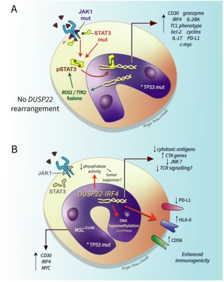 Molecular pathogenesis of systemic ALK- ALCL. (A) Mutations (mut) of JAK1 and/or STAT3 as well as the co-mutation of JAK and STAT have been implicated in the pathogenesis of this lymphoma. These mutations result in the constitutive activation of STAT (phosphorylated STAT; pSTAT3) that translocates to the nucleus and induces multiple genes resulting in the expression/activation of the molecules listed and of a T-cell lymphoma (TCL) phenotype Additionally, chimeric fusion genes with concomitant transcriptional and kinase activity (ROS1, TYK2) are also capable of sustaining the ALCL phenotype via pSTAT3. The activation of the JAK/STAT pathway is only found in cases without the DUSP22 rearrangement. (B) ALK- ALCL with DUSP22-IRF4 rearrangement/t(6;7)(p25.3;q32.3) is associated with downregulation of DUSP22 (dual specificity phosphatase 22) and likely its decreased phosphatase activity that may result in tumor suppressor effects that are yet unknown. The DUSP22-IRF4 rearrangement has been associated with a decreased expression of cytotoxic molecules, marked DNA hypomethylation, and an enhanced immunogenicity via the overexpression of immunogenic cancer-testis antigen (CTA) genes, HLA class II and CD58, and the downregulation of PD-L1. These mechanisms may contribute to the favorable prognosis seen in this group of ALK- ALCLs. Most DUSP22-rearranged cases also harbor a recurrent mutation in musculin (MSCE116K) that induces the expression of the CD30–IRF4–MYC axis. In vitro studies have shown that DUSP22 has the capacity to suppress TCR-induced activation/signaling and JNK signaling that could also have an effect on the pathogenesis of this lymphoma. In both scenarios, the presence or acquisition of a TP53 mutation (*) confers a bad prognosis.