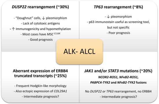 The relevant molecular alterations known to date in ALK- ALCL are summarized in Figure 10.