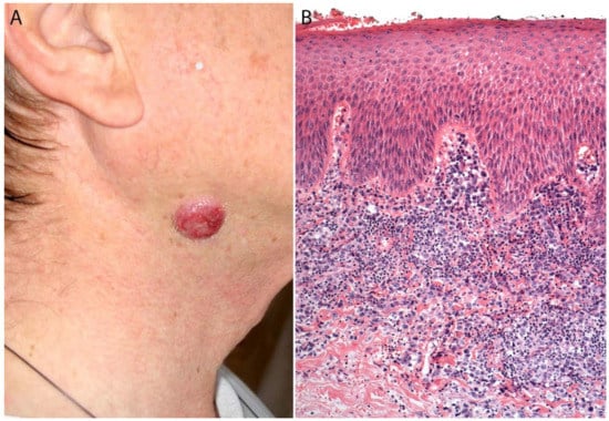 Clinically, pc-ALCL most frequently affects the trunk, face, and extremities (Figure 11A). Most patients present with large (>2 cm) nodules or papules that grow rapidly. They can be single or sometimes grouped and are often ulcerated and reddish-brown. Although pc-ALCL may sometimes undergo spontaneous regression in ~25% of patients, it is less likely to self-resolve than LyP [94,97]. Relapse is common and progression to systemic disease is rare [104]. Patients with extensive skin lesions on the legs or arms show statistically significant worse prognoses [103].
