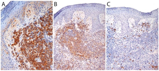 - Magro, C.M.; Dyrsen, M.E. Cutaneous lymphocyte antigen expression in benign and neoplastic cutaneous B- and T-cell lymphoid infiltrates. J. Cutan. Pathol. 2008, 35, 1040–1049. [Google Scholar] [CrossRef] [PubMed]