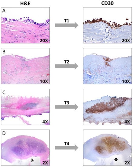 - Prieto-Torres, L.; Rodriguez-Pinilla, S.M.; Onaindia, A.; Ara, M.; Requena, L.; Piris, M. CD30-positive primary cutaneous lymphoproliferative disorders: Molecular alterations and targeted therapies. Haematologica 2019, 104, 226–235. [Google Scholar] [CrossRef] [PubMed]
