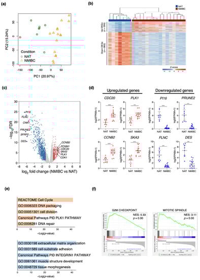 Several sets of NMIBC biomarkers have been proposed [21,22,23,24]. However, no reliable prognostic markers have been established. Hence, we performed RNA sequencing (RNA-seq) to profile the relative changes in gene expression in bladder tumor tissues (n = 16) and NAT (n = 8) excised from NMIBC patients. We then attempted to identify a set of prognostic biomarkers for NMIBC patients. The transcriptome profiles distinguished tumor tissues from NAT based on a principal component analysis (PCA) plot analyzed using the expression levels of all known genes (Table 1; Figure 1a). A comparison of the transcriptomes between the tumor tissues and NAT identified 1288 differentially expressed genes (DEGs) of which 296 were upregulated and 992 were downregulated (FDR < 0.05; >two-fold difference in expression level; FPKM > 2) (Figure 1b). Volcano and scatter plots showed that the gene expression levels in NMIBC significantly differed from those in NAT (Figure 1c). CDC20, CCNB2, PLK1, and SKA3 were significantly upregulated whereas PI16, PRUNE2, FLNC, and DES were significantly downregulated in NMIBC (Figure 1d). To infer the potential functions of the DEGs, we conducted a gene ontology (GO) analysis in Metascape. The cell cycle (p = 2.98 × 10−42), cell division (p = 1.04 × 10−28), and DNA repair (p = 2.20 × 10−13) pathways were significantly enriched in NMIBC compared to NAT. All these pathways are associated with the cellular alteration characteristic of bladder cancer. By contrast, the extracellular matrix organization (p = 1.12 × 10−43) and muscle structure development (p = 8.93 × 10−24) pathways were significantly associated with the downregulated genes in NMIBC (Figure 1e). A gene set enrichment analysis (GSEA) showed that cell cycle-related pathways such as G2M checkpoint and mitotic spindle were significantly associated with the upregulated genes in NMIBC (Figure 1f). Overall, the results indicate that the cell cycle-related gene sets were significantly altered in NMIBC tumor tissues.