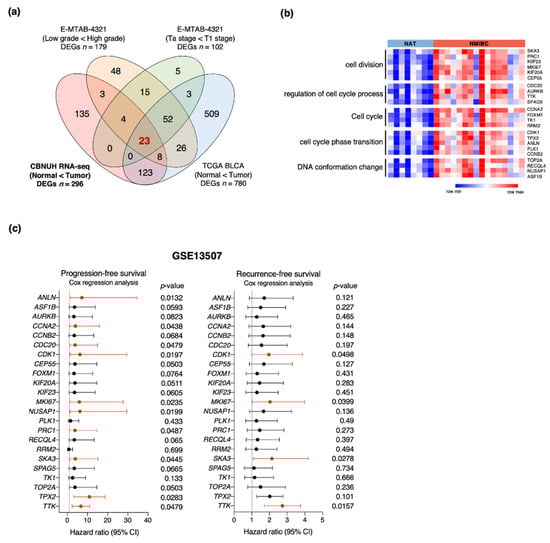 To identify reliable prognostic biomarkers for bladder cancer patients, we reanalyzed available RNA-seq data from two independent cohorts, namely, The Cancer Genome Atlas urothelial bladder carcinoma (TCGA-BLCA) and E-MTAB-4321 (UROMOL) [43]. We also used our own RNA-seq data designated CBNUH. The DEGs were identified in each cohort using the same criteria as those for the analysis of the CBNUH RNA-seq data. As the E-MTAB-4321 cohort contains tumor grade and staging information, we identified prognosis-related DEGs either by comparing high vs. low grades or by comparing T1 vs. Ta stages. All DEGs in these cohorts were then intersected to select the commonly upregulated prognosis-related genes in bladder cancers relative to their corresponding controls. We finally identified 23 genes (Figure 2a). A GO analysis showed that all of them were significantly associated with cell cycle-related pathways (Figure 2b). We analyzed an independent NMIBC cohort (GSE13507) with a Cox proportional regression model to estimate the prognostic significance of these genes (Figure 2c). Ten of the 23 genes were significantly associated with progression-free survival (PFS), while four (SKA3, MKI67, CDK1, and TTK) were related to recurrence-free survival (RFS) in NMIBC. The four latter genes were associated with worse clinical outcomes. We selected the SKA3 gene for further analysis as its prognostic potential in bladder cancer patients has never been investigated.