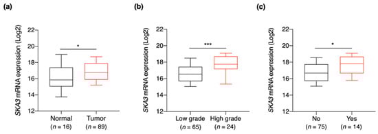 To determine whether SKA3 expression is a potential prognostic biomarker for NMIBC patients, we measured it by qPCR in tumor tissues from 89 NMIBC patients and in 16 normal bladder tissues (Table 2). The results of the RNA-seq data analysis (Figure 1 and Figure 2) showed that SKA3 expression was significantly higher in NMIBC tissues than normal bladder mucosa (p < 0.05) (Figure 3a). Additionally, SKA3 was significantly overexpressed in high-grade NMIBC tissues compared with low-grade NMIBC tissues (p < 0.001; Figure 3b). However, SKA3 was significantly upregulated in the tumor tissues of NMIBC patients who had progressed to MIBC compared to those without progression (p < 0.05; Figure 3c). These results demonstrate that SKA3 upregulation potentially serves as a prognostic biomarker for NMIBC patients.