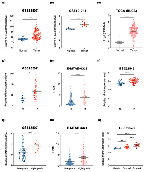 Bladder cancer is the most prevalent cancer of the urinary tract and has the thirteenth highest cancer mortality rate worldwide [1]. Moreover, its prognosis and survival have not improved over the past few decades [2,3]. Bladder cancer is classified either as non-muscle invasive bladder cancer (Ta–T1; NMIBC) or muscle-invasive bladder cancer (T2–T4; MIBC), depending on whether the tumor has invaded the muscle layer [4,5]. Approximately 75–80% of all newly diagnosed bladder cancer patients are NMIBC while 20–25% are MIBC [6,7,8]. Despite transurethral resection (TUR) and intravesical chemotherapy, over 40% of all NMIBC tumors recur and approximately 10% of all NMIBC-diagnosed patients progress to MIBC [9,10]. It is difficult to identify the latter as its molecular characteristics are highly variable during progression [11,12]. Moreover, MIBC patients are relatively more likely to develop metastasis than NMIBC patients and the survival rates are significantly lower in the former than the latter [13,14]. Hence, early cystectomy is sometimes considered for patients with aggressive NMIBC in order to prevent progression to MIBC [4,15]. There is an urgent need for reliable, high-specificity biomarkers that can accurately predict prognoses and clinical outcomes in bladder cancer patients.