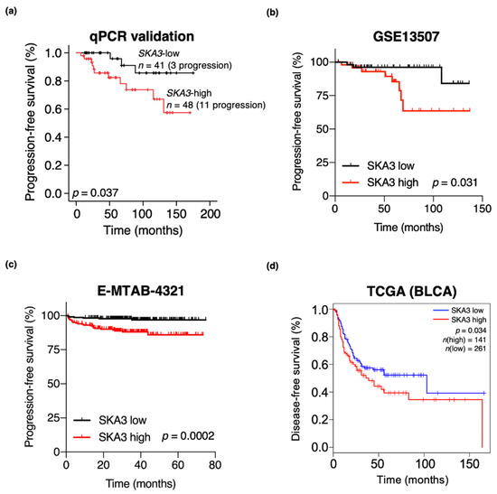 To evaluate the role of SKA3 in predicting NMIBC patient prognosis, we conducted univariate and multivariate Cox regression analyses of the qPCR validation cohort with long-term follow-up. In NMIBC patients, SKA3 expression was an independent predictor of PFS (HR, 4.155; 95% CI, 1.043–16.544; p = 0.043) (Table 3). To estimate whether SKA3 expression has clinical implications, we classified NMIBC patients into SKA3 high and SKA3 low groups based on their median SKA3 expression levels (Figure S1a–c). A Kaplan–Meier survival analysis showed that the NMIBC patients in the SKA3 high-expression groups had significantly shorter PFS than those in the SKA3 low-expression groups of the qPCR validation (log-rank test; p = 0.037; Figure 5a), GSE13507 (log-rank test; p = 0.031; Figure 5b), and E-MTAB-4321 (log-rank test; p = 0.0002; Figure 5c) cohorts. In the GSE13507 cohort, the SKA3 high-expression group also had a significantly shorter RFS than the SKA3 low-expression group (Figure S1d). In the TCGA cohort (log-rank test; p = 0.034; Figure 5d), the MIBC patients with high SKA3 expression were correlated with worse prognoses than those with low SKA3 expression. Several candidate genes were analyzed in multiple cohorts (Figure S2). These results suggest that SKA3 is a promising prognostic marker for NMIBC patients.
