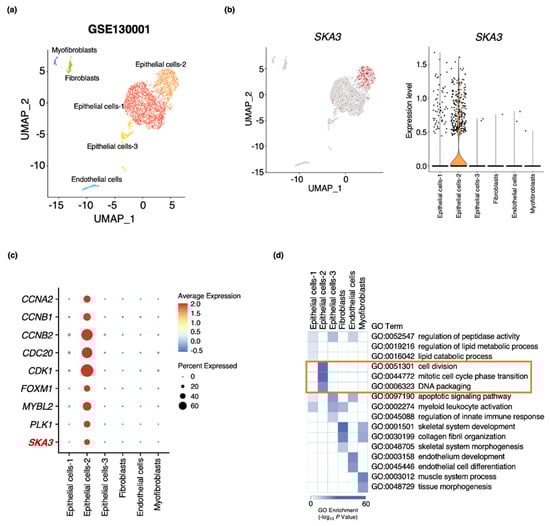 Bladder cancer is heterogeneous at the cellular and transcriptional levels [11]. To investigate SKA3 expression in the various cellular compartments of bladder tumor tissues, we reanalyzed a public single-cell RNA sequencing (scRNA-seq) dataset performed on CD45-negative cells acquired from MIBC patients [41]. We categorized 3774 cells into six clusters based on gene expression patterns (Figure 6a and Figure S3a). Those in the Epithelial cells-2 cluster within the epithelial compartment showed the highest SKA3 expression level (Figure 6b). According to the CBNUH RNA-seq data (Figure 1 and Figure 2), the cells in this cluster showed the highest expression levels of the genes implicated in the latter stages of the cell cycle including CCNA2, CCNB1, CCNB2, CDC20, CDK1, FOXM1, MYBL2, and PLK1 (Figure 6c). A GO analysis of the six clusters furnished evidence that each subpopulation was correlated with unique biological functions in bladder cancer. For example, myofibroblasts and Epithelial cells-3 clusters were significantly associated with the muscle system and the apoptotic signaling pathway, respectively. The predicted functions of the Epithelial cells-2 cluster resembled those of the upregulated DEGs identified in the CBNUH RNA-seq dataset (Figure 6d). MKI67 encoding a cell proliferation marker showed the highest expression level in the Epithelial cells-2 cluster (Figure S3b). These data indicate that the epithelial cell subpopulation strongly expressing SKA3 may contribute to aggravating bladder cancer.