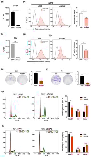 SKA3 knockdown suppressed bladder cancer cell proliferation by inhibiting G2/M transition. (a,b) RT-qPCR results showing specific inhibition of SKA3 expression by siRNA transfection. (c,d) Representative flow cytometry histograms of SKA3 expression in 5647 and T24 cell lines treated with siNC or siSKA3 (left). SKA3 protein levels (MFI relative to isotype) in each cell line in triplicate (right). (e,f) Colony formation assay showing that SKA3 promotes proliferation of bladder cancer cell lines 5637 and T24. (g,h) Cell cycle progression assay of 5637 and T24 cell lines transfected either with non-targeting control (NC) or SKA3 siRNA. Cell cycle analysis data measured by flow cytometry. Error bar: means ± SEM. P values determined by Welch’s t-test. * p < 0.05, ** p < 0.01, *** p < 0.001, **** p < 0.0001. MFI, mean fluorescence intensity.