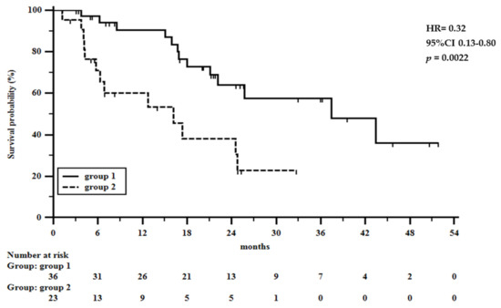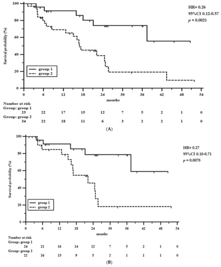 According to our previous experiences in colorectal and gastric cancers, NPS was calculated based on the following four parameters: serum albumin (normal: ≥4 g/dL), total cholesterol (normal: >180 mg/dL), LMR (normal: ≤2.96), and NLR (normal: >4.44) [32,33]. Each parameter was assigned a score (normal value = 0, altered value = 1), and patients were initially assigned a score of 0 to 4 (NPS score). Afterwards, patients were divided into three groups (NPS group): patients with score = 0 were assigned to group 0 (normal values for all 4 parameters); patients with score 1 or 2 were assigned to group 1 (one or two altered values); and patients with score 3 or 4 were assigned to group 2 (three or four altered values).