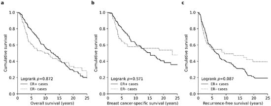Survival functions in the ER+ and ER− patients. (a) ER− BC was associated with poor short-term overall survival and (b) breast cancer-specific survival especially during the first five years of follow-up compared to ER+ BC. (c) The difference in survival was lifted off over time, mainly due to different recurrence rates on long-term follow-up.
