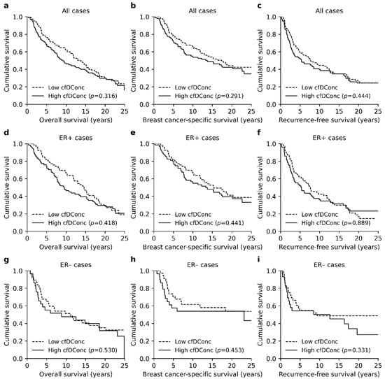 Kaplan–Meier plots representing the association between cfDConc and BC survival. (a–c) Patients with high cfDConc had generally worse survival, although the only significant difference in survival was observed for OS at the 10-year follow-up (p = 0.022). (d–f) A similar survival trend was observed in the ER+ patients with a significant association with OS at the 10-year follow-up (p = 0.017). (g–i) The association with poor survival was less prominent in the ER− patient cohort.