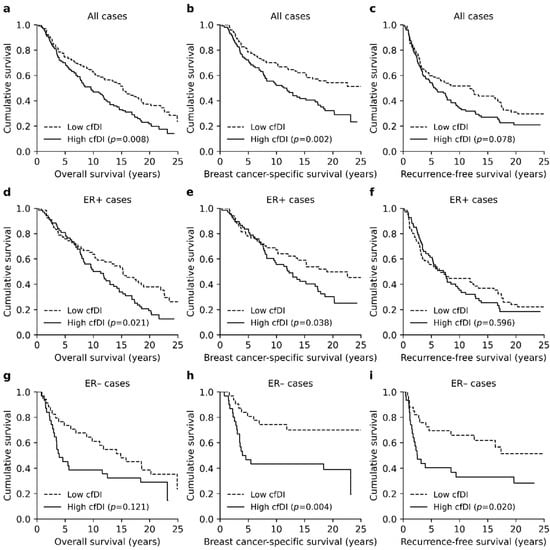 Kaplan–Meier plots representing the association between cfDI and survival. (a) High cfDI was associated with poor OS (p = 0.002) and (b) BCSS (p = 0.008). (c) The association with RFS was less prominent and only visible at the 10- and 15-year follow-ups (p = 0.045 and p = 0.037). (d,e) In ER+ patients, high cfDI was associated with poor OS and BCSS, but (f) association with RFS was not observed. (g) In ER− patients, high cfDI was associated with poor OS and (h) poor BCSS at the 5- and 10-year follow-ups (p = 0.024 and p = 0.045). (i) Association between high cfDI and poor RFS was the most prominent in ER− patients. All p-values were obtained by the Logrank test.