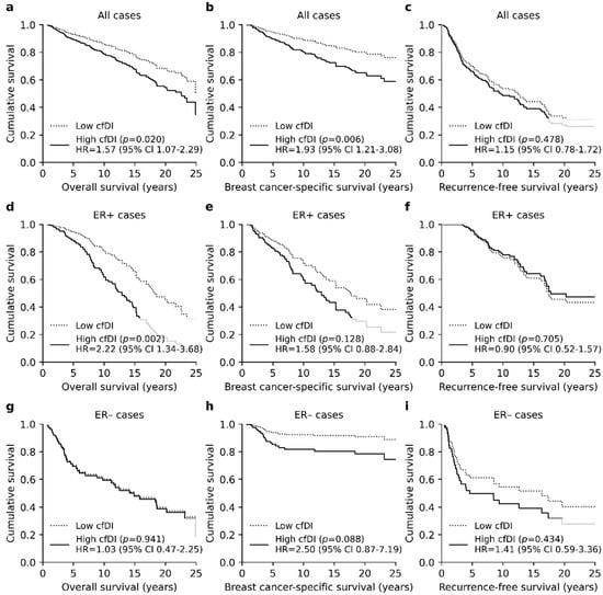 Multivariate survival analysis indicated that cfDI is an independent prognostic factor for poor OS (p = 0.020, hazard ratio (HR) = 1.57, 95% confidence interval (CI) 1.07–2.29, Figure 4a) and BCSS (p = 0.006, HR = 1.93, 95% CI 1.21–3.08, Figure 4b) when dividing patients according to the median cfDI. The association with RFS was not prominent (p = 0.478, Figure 4c). In the ER+ patient group, high cfDI was an independent prognostic factor for poor OS (p = 0.002, HR = 2.22, 95% CI 1.34–3.68, Figure 4d), but the associations with BCSS and RFS were less prominent (p = 0.128 and p = 0.705, Figure 4e,f). In the ER− patient group, high cfDI was associated with poor BCSS (p = 0.088, Figure 4g) but remained non-significant in our analysis. Associations with OS and RFS were not notable (p = 0.941 and p = 0.434, Figure 4h,i). In general, the survival of the ER− patients was explained mainly by the tumor stage and positive lymph node status.
