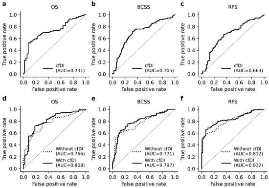 Univariate logistic regression with cfDI predicted the clinical outcomes of OS (AUC = 0.731, 95% CI 0.683–0.780), BCSS (AUC = 0.705, 95% CI 0.659–0.751) and RFS (AUC = 0.663, 95% CI 0.612–0.719) with an acceptable accuracy (Figure 5a–c). Multivariate logistic regression with key tumor features and patient age outperformed the univariate analysis (Figure 5d–f) in all cases, and inclusion of cfDI in the multivariate analysis further improved the general performance of the models. The AUCs obtained for multivariate logistic regression models with key tumor features and cfDI were 0.808 (95% CI 0.760–0.859), 0.797 (95% CI 0.757–0.841), and 0.832 (95% CI 0.796–0.871) for OS, BCSS, and RFS, respectively. The improvement was significant only in models predicting OS and BCSS (p = 0.057 and p < 0.001, DeLong); the model predicting RFS did not significantly benefit from the inclusion of cfDI (p = 0.977).