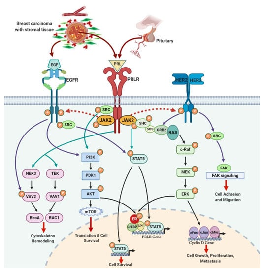 The relevance of autocrine PRL in tumor initiation and its role in breast cancer progression has been well studied in transgenic mice models. NRL-PRL transgenic mice which mimic autocrine PRL effects develop aggressive mammary tumors of luminal B subtype [19]. Several mouse tumor models have somatic KRAS alterations associated with increased p-ERK1/2, decreased signal transducer and activator of transcription 5 (STAT5), and variable PRL levels [20,21,22]. Constitutive PRL signaling in mammary glands affects the tumor environment by altering the RAS pathway activation and induces aggressive tumors [22]. Interestingly, endogenous PRL induces ER responsiveness and enhances PRLR expression/transcription resulting in proliferation of breast cancer cells [23,24]. In addition, PRL can also induce non-classical and unliganded ER signaling. In MCF-7 cells, PRL and estrogen enhance AP-1 activity through phosphorylation of p38, ERK1/2, and c-Fos [25]. Conversely, estrogen can alter PRL-induced signaling by regulating the transcription of PRL in breast cancer cells and in rat pituitary cells [26,27]. Estrogen can also increase PRL-activated Stat5 activity in breast cancer cells [28]. More recently, we demonstrated the role of endogenous PRL in the upregulation of PRLR transcription induced by ERα in MCF-7 cells and requisite participation of STAT5a and complex formation with Sp1/C/EBPβ at the PRLR hPIII promoter [24]. PRLR is involved in the activation of MAPK/ERK signaling in several breast cancer cell lines, which mediate PRL-induced biological activity in these cells [29,30,31]. In addition to mammary carcinoma, PRLR signaling is also implicated in the development of prostate, colon, ovarian and endometrial cancers. PRL induces PRLR-mediated Jak2-STAT signaling in prostate cancer, and in colon cancer by modulating Notch signaling in a Jak2-STAT3/ERK manner [32,33]. Higher expression levels of PRLR were found in ovarian and endometrial tumors. PRL can also induce proliferation in endometrial and ovarian cancer cell lines [34]. In this review we highlight the crosstalk between downstream signaling cascades activated by PRLR and EGFR/HER2 in breast cancer and discuss how these receptors work together to affect breast cancer behavior and promote cancer progression. This review on the crosstalk between PRLR and EGFR/HER2 receptors activating several overlapping signaling cascades might explain their role in resistance to endocrine therapies often resulting in relapse, however further studies are warranted in clinical samples and using mice xenograft models. Also, provides a rationale for the use of combined therapeutic inhibitors targeting receptors and/or associated signaling pathways in the treatment of invasive breast cancer.