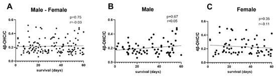 Correlation between 4β-hydroxycholesterol/cholesterol ratio (4β-OHC/C) and survival time measured in days in (A) all patients (n = 137) (B) males (n = 69), and (C) females (n = 68). Statistical analysis was performed using Spearman’s rank test. r = Spearman’s r.