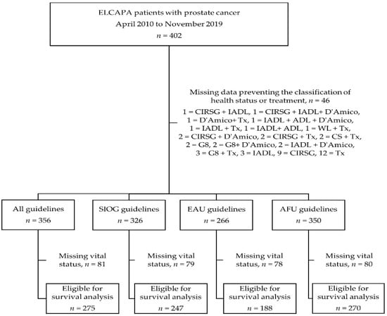Flow diagram of participants and available data, depending on the set of guidelines. ADL: Activities of Daily Living score, AFU: French Association of Urology, CIRS-G: Cumulative Illness Rating Scale for Geriatrics, CS: clinical stage, D’Amico: D’Amico risk group classification system, EAU: European Association of Urology, IADL: Instrumental Activities of Daily Living score, SIOG: International Society of Geriatric Oncology, Tx: treatment, WL: weight loss.