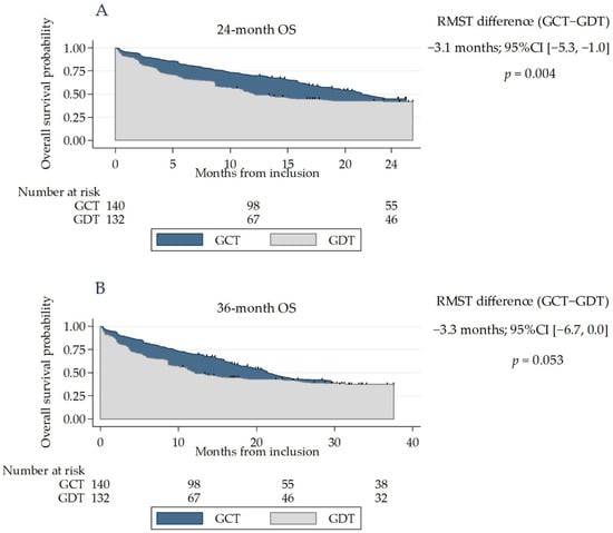 Weighting achieved a good covariate balance between the groups (Table 2). The risk of death did not differ significantly between groups at 24 (weighted HR (95% CI) = 1.31 (0.92–1.87); p = 0.1) and 36 months (weighted HR (95% CI) = 1.22 (0.87–1.71); p = 0.2). However, the proportional hazards assumption was not satisfied (p ≤ 0.01 for both of Schoenfeld residuals). The 24-month expected time to death was significantly shorter in the GDT group than in the GCT group (13.9 vs. 17 months, respectively; difference (95% CI): −3.1 months (−5.3, −1.0); p = 0.004). RMST at 36 months was 18.5 months, vs. 21.8 months (difference: −3.3 months (−6.7, 0.0); p = 0.053). (Figure 2).